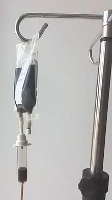 Iron sucrose is a dark brown liquid solution. It is administered intravenously and is only used when a patient with iron deficiency cannot be treated using oral iron options.[5] It is a generally effective drug, with more than 80% of patients responding to treatment. Iron sucrose has ~20 mg of iron per mL of solution. A typical adult patient can safely receive 600 mg of iron sucrose per week, administered in separate doses of 200–300 mg. Most patients experience an increase in their hemoglobin levels of at least 20 g/L.[3] Administration usually takes from fifteen to thirty minutes[3] and is done by a medical professional. Often, saline solution is mixed with the iron sucrose during injection.[6]