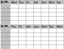 A sleep diary with nighttime in the middle and the weekend in the middle, to better notice trends