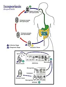 Cystoisospora belli, previously known as Isospora belli, is a parasite that causes an intestinal disease known as cystoisosporiasis.[1] This protozoan parasite is opportunistic in immune suppressed human hosts.[2] It primarily exists in the epithelial cells of the small intestine, and develops in the cell cytoplasm.[2] The distribution of this coccidian parasite is cosmopolitan, but is mainly found in tropical and subtropical areas of the world such as the Caribbean, Central and S. America, India, Africa, and S.E. Asia. In the U.S., it is usually associated with HIV infection and institutional living.[3]