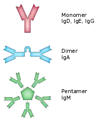IgM is first expressed as a monomer on the surface of immature B cells. Upon antigenic stimulation, IgM+ B cells secrete pentameric IgM antibody formed by five Ig monomers are linked via disulfide bonds. The pentamer also contains a polypeptide J-chain, which links two of the monomers and facilitates secretion at mucosal surfaces. The pentameric structure of IgM antibodies makes them efficient at binding antigens with repetitive epitopes (e.g. bacterial capsule, viral capsid) and activation of complement cascade. As IgM antibodies are expressed early in a B cell response, they are rarely highly mutated and have broad antigen reactivity thus providing an early response to a wide range of antigens without the need for T cell help.[5]