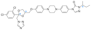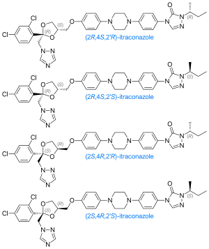 The itraconazole molecule has three chiral carbons. The two chiral centers in the dioxolane ring are fixed in relation to one another, and the triazolomethylene and aryloxymethylene dioxolane-ring substituents are always cis to each other. The clinical formulation is a 1:1:1:1 mixture of four stereoisomers (two enantiomeric pairs).[34][35]
