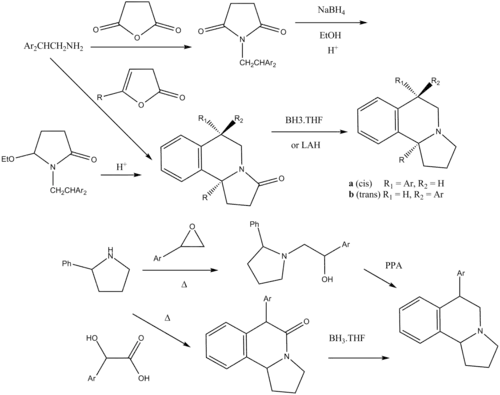 These molecules were first prepared by Bruce E. Maryanoff and coworkers during the late 1970s–1980s.[2][3][4] The structure is a pyrroloisoquinoline core, with an overlaid benzhydryl motif.
