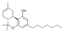 Tetrahydrocannabiphorol (THCP) is a potent phytocannabinoid, a CB1 and CB2 agonist which was known as a synthetic homologue of THC,[1] but for the first time in 2019 was isolated as a natural product in trace amounts from Cannabis sativa.[2][3] It is structurally similar to Δ9-THC, the main active component of cannabis, but with the pentyl side chain extended to heptyl. Since it has a longer side chain, its cannabinoid effects are "far higher than Δ9-THC itself." Tetrahydrocannabiphorol has a reported binding affinity approximately 33 times that of Delta-9-THC.[4]
