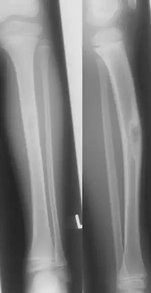 | Jaffe-Campanacci-Syndrome, boy 7 Y, tibial bowing and cortical/subcortial mixed sclerosis | |