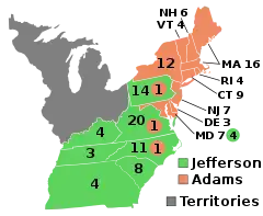 Prior to independence being declared, Adams organized and selected a Committee of Five charged with drafting a Declaration of Independence. He chose himself, Jefferson, Benjamin Franklin, Robert R. Livingston and Roger Sherman.[77] Jefferson thought Adams should write the document, but Adams persuaded the committee to choose Jefferson. Many years later, Adams recorded his reasoning to Jefferson: "Reason first, you are a Virginian, and a Virginian ought to appear at the head of this business. Reason second, I am obnoxious, suspected, and unpopular. You are very much otherwise. Reason third, you can write ten times better than I can."[78] The Committee left no minutes, and the drafting process itself remains uncertain. Accounts written many years later by Jefferson and Adams, although frequently cited, are often contradictory.[79] Although the first draft was written primarily by Jefferson, Adams assumed a major role in its completion.[80] On July 1, the resolution was debated in Congress. It was expected to pass, but opponents such as Dickinson made a strong effort to oppose it anyhow. Jefferson, a poor debater, remained silent while Adams argued for its adoption.[81] Many years later, Jefferson hailed Adams as "the pillar of [the Declaration's] support on the floor of Congress, [its] ablest advocate and defender against the multifarious assaults it encountered."[82] After editing the document further, Congress approved it on July 2. Twelve colonies voted in the affirmative, while New York abstained. Dickinson was absent.[83] On July 3, Adams wrote to Abigail that "yesterday was decided the greatest question which was ever debated in America, and a greater perhaps never was nor will be decided among men." He predicted that "[t]he second day of July, 1776, will be the most memorable epoch in the history of America," and would be commemorated annually with great festivities.[84]