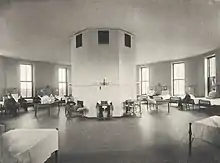 Osler, the first chief of the Department of Medicine, is credited with originating the idea of a residency, whereby recently graduated doctors receive advanced training in their specialty while treating patients under supervision; then as now, residents comprise most of the medical staff of the hospital. He also introduced the idea of bringing medical students into actual patient care early in their training; at the time medical school consisted almost entirely of lectures. Osler's contribution to practical education extends to the creation of "grand rounds", the practice of leading physicians discussing the most difficult cases in front of assembled medical students, for the benefit of patients and students.[17][18] The term “rounds” derives from the circular ward where bedside teaching occurred.[19] He once said he hoped his tombstone would say only, "He brought medical students into the wards for bedside teaching."[14]