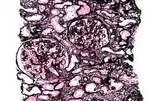 Micrograph of a kidney biopsy stained with a Jones stain.