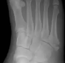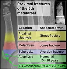 Other proximal fifth metatarsal fractures exist, although they are not as problematic as a Jones fracture. If the fracture enters the intermetatarsal joint, it is a Jones fracture. If, however, it enters the tarsometatarsal joint, then it is likely an avulsion fracture caused by pull from the fibularis brevis tendon. An avulsion fracture at the base of the fifth metatarsal is sometimes called a "dancer's fracture" or a "pseudo Jones fracture", and usually responds readily to non-operative treatment.[18] The X-ray appearance of the developmental "apophysis" in this area may have some resemblance of a fracture, but is not a fracture; it is the secondary ossification center of the metatarsal bone. It is a normal finding that occurs at this site in adolescents.[19] If an injury to that area has occurred, the physician is often able to interpret certain radiographic clues to make the differentiation. An avulsion fracture at this location is typically extra-articular and oriented transversally as compared to the longitudinal orientation of an unfused apophysis.[19]