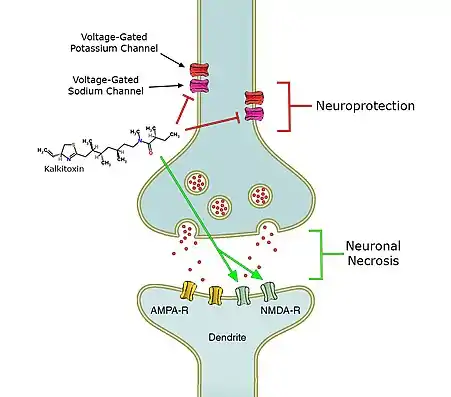 Kalkitoxin induces delayed neuronal necrosis in cerebellar granule cells of the rat.[1] This neuronal necrosis proved to be NMDA-receptor mediated.[1] These receptors are normally activated by glutamate and other excitotoxic compounds and can induce neuronal necrosis.[1] It is not yet known if the toxin induces necrosis directly or via the release of excitotoxic compounds.[1]