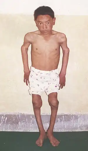 Kashin–Beck disease (KBD) is a chronic, endemic type of osteochondropathy (disease of the bone) that is mainly distributed from northeastern to southwestern China, including 15 provinces.[1] As of 2011, Tibet has the highest incidence rate of KBD in China.[1] Southeast Siberia and North Korea are other affected areas.[1] KBD usually involves children ages 5–15. To date, more than a million individuals have had KBD.[2] The symptoms of KBD include joint pain, morning stiffness in the joints, disturbances of flexion and extension in the elbows, enlarged inter-phalangeal joints, and limited motion in many joints of the body.[3] Death of cartilage cells in the growth plate and articular surface is the basic pathologic feature; this can result in growth retardation and secondary osteoarthrosis.[1] Histological diagnosis of KBD is particularly difficult; clinical and radiological examinations have proved to be the best means for identifying KBD.[4] Little is known about the early stages of KBD before the visible appearance of the disease becomes evident in the destruction of the joints.[4]