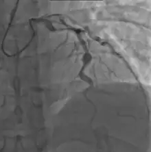 Many risk factors predicting coronary artery aneurysms have been identified,[21] including persistent fever after IVIG therapy,[56][57] low hemoglobin concentrations, low albumin concentrations, high white-blood-cell count, high band count, high CRP concentrations, male sex, and age less than one year.[58] Coronary artery lesions resulting from Kawasaki disease change dynamically with time.[3] Resolution one to two years after the onset of the disease has been observed in half of vessels with coronary aneurysms.[59][60] Narrowing of the coronary artery, which occurs as a result of the healing process of the vessel wall, often leads to significant obstruction of the blood vessel and the heart not receiving enough blood and oxygen.[59] This can eventually lead to heart muscle tissue death, i.e., myocardial infarction (MI).[59]