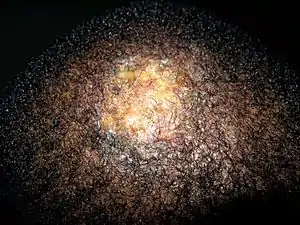 Kerion or kerion celsi is an acute inflammatory process which is the result of the host's response to a fungal ringworm infection of the hair follicles of the scalp (occasionally the beard) that can be accompanied by secondary bacterial infection(s). It usually appears as raised, spongy lesions, and typically occurs in children.[1] This honeycomb is a painful inflammatory reaction with deep suppurative lesions on the scalp. Follicles may be seen discharging pus. There may be sinus formation and rarely mycetoma-like grains are produced. It is usually caused by dermatophytes (fungal infections of the skin affecting humans and animals) such as Trichophyton verrucosum, T. mentagrophytes,[1] and Microsporum canis. Treatment with oral griseofulvin common.[1]