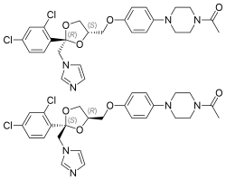 Ketoconazole is a racemic mixture consisting of cis-(2S,4R)-(−) and cis-(2R,4S)-(+) enantiomers.[7] The cis-(2S,4R) isomer was more potent in inhibiting progesterone 17α,20-lyase than its enantiomer (IC50 values of 0.05 and 2.38 μM, respectively) and in inhibiting 11β-hydroxylase (IC50 values of 0.152 and 0.608 μM, respectively). Both isomers were relatively weak inhibitors of human placental aromatase.[6]