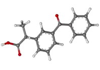 Ketoprofen undergoes metabolism in the liver via conjugation with glucuronic acid (glucuronidation) by UGT enzymes, hydroxylation of the benzoyl ring by the CYP3A4 and CYP2C9 enzymes, and reduction of its ketone moiety (a carbonyl functional group, i.e. with carbon-oxygen double bond)[11] by carbonyl reducing enzymes (CREs).[12][13] Ketoprofen is used for its antipyretic, analgesic, and anti-inflammatory properties by inhibiting cyclooxygenase-1 and -2 (COX-1 and COX-2) enzymes reversibly, which decreases production of proinflammatory prostaglandin precursors.[12][14]