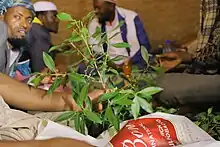 The khat plant is known by a variety of names, such as qat and gat in Yemeni Arabic, qaat and jaad in Somali, and chat in Amharic.[3] It is also known as jimaa in the Oromo language, mayirungi in Luganda, and as miraa in Swahili. In the African Great Lakes region, where Catha edulis is (in some areas) cultivated, it is known as miraa, muhulo and muirungi.[10][11]