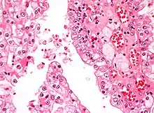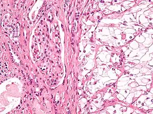 | Micrograph showing the most common type of kidney cancer (clear cell renal cell carcinoma). H&E stain. | |