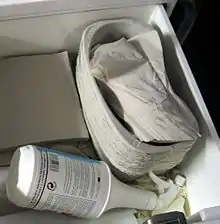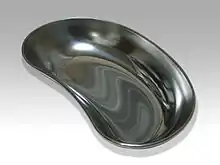 A kidney dish (British English) or emesis basin (American English) is a shallow basin with a kidney-shaped base and sloping walls used in medical and surgical wards to receive soiled dressings and other medical waste. Generally, the volume of a pulp kidney dish (or "vomit dish") is 700 mL. Its length is 25 cm-26 cm, its width 11 cm. The shape of the dish allows it to be held against the patient's body to catch any falling fluids or debris. Various sizes of emesis basins are common in healthcare settings, including facilities such as nursing homes that may have bedridden patients.