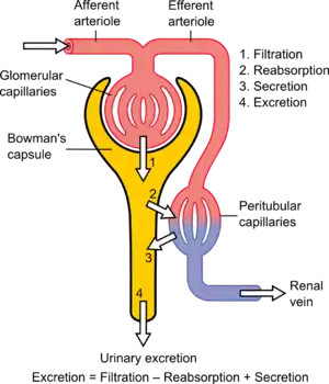 The glomerular filtration rate (GFR) describes the volume of fluid filtered from the renal (kidney) glomerular capillaries into the Bowman's capsule per unit time.[2] Creatinine clearance is the volume of blood plasma that is cleared of creatinine per unit time and is a useful measure for approximating the GFR. Creatinine clearance exceeds GFR due to creatinine secretion,[3] which can be blocked by cimetidine. Both GFR and CCr may be accurately calculated by comparative measurements of substances in the blood and urine, or estimated by formulas using just a blood test result (eGFR and eCCr) The results of these tests are used to assess the excretory function of the kidneys. Staging of chronic kidney disease is based on categories of GFR as well as albuminuria and cause of kidney disease.[1]