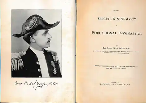 In 1886, the Swedish Medical Gymnast Nils Posse (1862-1895) introduced the term kinesiology in the U.S.[81] Nils Posse was a graduate of the Royal Gymnastic Central Institute in Stockholm, Sweden and founder of the Posse Gymnasium in Boston, MA. He was teaching at Boston Normal School of Gymnastics BNSG.[82] The Special Kinesiology Of Educational Gymnastics was the first book ever written in the world with the word "Kinesiology" in the title of the book. It was written by Nils Posse and published in Boston, 1894–1895.[83] Posse was elected posthumously as an Honorary Fellow in Memoriam in the National Academy of Kinesiology.[84]