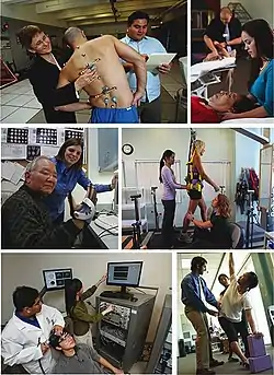 Kinesiology (from Ancient Greek κίνησις (kínēsis) 'movement', and -λογία -logía 'study of') is the scientific study of human body movement. Kinesiology addresses physiological, anatomical, biomechanical, pathological, neuropsychological principles and mechanisms of movement. Applications of kinesiology to human health include biomechanics and orthopedics; strength and conditioning; sport psychology; motor control; skill acquisition and motor learning; methods of rehabilitation, such as physical and occupational therapy; and sport and exercise physiology. Studies of human and animal motion include measures from motion tracking systems, electrophysiology of muscle and brain activity, various methods for monitoring physiological function, and other behavioral and cognitive research techniques.[1][2]
