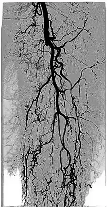 Kinetic imaging is an imaging technology developed by Szabolcs Osváth and Krisztián Szigeti in the Department of Biophysics and Radiation Biology at Semmelweis University (Budapest, Hungary). The technology allows the visualization of motion; it is based on an altered data acquisition and image processing algorithm combined with imaging techniques that use penetrating radiation (e.g., X-rays). Kinetic imaging has the potential for use in a wide variety of areas including medicine, engineering, and surveillance. For example, physiological movements, such as the circulation of blood or motion of organs can be visualized using kinetic imaging. Because of the reduced noise and the motion-based image contrast, kinetic imaging can be used to reduce X-ray dose and/or amount of required contrast agent in medical imaging (e.g., X-ray angiography).[1][2] In fact, clinical trials are underway in the fields of vascular surgery and interventional radiology.[1][2][3][4] Non-medical applications include non-destructive testing of products and port security scanning for stowaway pests.[5]