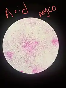 The Kinyoun method or Kinyoun stain (cold method), developed by Joseph J. Kinyoun, is a procedure used to stain acid-fast species of the bacterial genus Mycobacterium.[1] It is a variation of a method developed by Robert Koch in 1882. Certain species of bacteria have a waxy lipid called mycolic acid, in their cell walls which allow them to be stained with Acid-Fast better than a Gram-Stain. The unique ability of mycobacteria to resist decolorization by acid-alcohol is why they are termed acid-fast.[2] It involves the application of a primary stain (basic fuchsin), a decolorizer (acid-alcohol), and a counterstain (methylene blue).[3] Unlike the Ziehl–Neelsen stain (Z-N stain), the Kinyoun method of staining does not require heating.[4][5] In the Ziehl–Neelsen stain, heat acts as a physical mordant while phenol (carbol of carbol fuchsin) acts as the chemical mordant. Since the Kinyoun stain is a cold method (no heat applied), the concentration of carbol fuschin used is increased.[6]