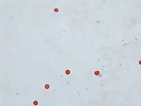 Thin smears are prepared from capillary blood or venous blood collected into anticoagulants such as heparine, oxalate, citrate, or EDTA. Smears are air dried between 10–60 minutes, fixed in 80 vol% ethanol for 5 min at 20-22 °C, rinsed with tap water, and air dried. Films are then immersed in the citrate-phosphate buffer for 5 minutes at 37 °C and gently agitated for about 3 minutes. Slides are rinsed with tap water, dried, and stained with Ehrlich's acid hematoxylin for 3 min, rinsed with water, and dried again. They are counterstained with erythrosine for 3 min. After a final rinse, films are dried and examined under light microscopy.[4]