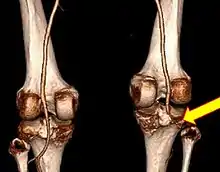 A knee dislocation is an injury in which there is disruption of the knee joint between the tibia and the femur.[3][4] Symptoms include pain and instability of the knee.[2] Complications may include injury to an artery, most commonly the popliteal artery behind the knee, or compartment syndrome.[3][4][7]