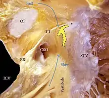 Koch's triangle, named after the German pathologist Walter Koch,[1] is an anatomical area located in the superficial paraseptal endocardium of the right atrium, which its boundaries are the coronary sinus orifice, tendon of Todaro, and septal leaflet of the right atrioventricular valve.[2] It is anatomically significant because the atrioventricular node is located at the apex of the triangle. Also the elements anatomically near to it are the membranous septum and the Eustachian ridge. This triangle ends at the site of the coronary sinus orifice inferiorly and, continuous with the sub-Eustachian pouch. The tendon of Todaro forms the hypotenuse of the triangle and the base is formed by the coronary sinus orifice and the vestibule of the right atrium. Variations in the size of Koch's triangle are common.