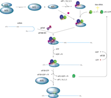 The scanning mechanism of Initiation starts when the PIC binds the 5′ end of the mRNA. Scanning is stimulated by Dhx29 and Ddx3/Ded1 and eIF4 proteins.[1] The Dhx29 and Ddx3/Ded1 are DEAD-box helicases that help to unwind any secondary mRNA structure which could hinder scanning.[17] The scanning of an mRNA continues until the first AUG codon on the mRNA is reached, this is known as the "First AUG Rule".[1] While exceptions to the "First AUG Rule" exist, most exceptions take place at a second AUG codon that is located 3 to 5 nucleotides downstream from the first AUG, or within 10 nucleotides from the 5′ end of the mRNA.[18] At the AUG codon a Methionine tRNA anticodon is recognized by mRNA codon.[19] Upon base pairing to the start codon the eIF5 in the PIC helps to hydrolyze a guanosine triphosphate (GTP) bound to the eIF2.[20][21] This leads to the a structural rearrangement that commits the PIC to binding to the large ribosomal subunit (60S) and forming the ribosomal complex (80S). Once the 80S ribosome complex is formed then the elongation phase of translation starts.