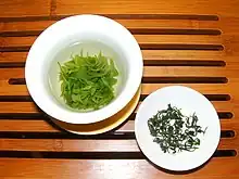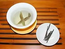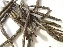Kuding or kuzding (Chinese: 苦丁茶; pinyin: kǔdīng chá; lit. 'bitter nail tea'; pronounced [kʰù.tíŋ ʈʂʰǎ]) is a particularly bitter-tasting Chinese infusion, which due to their similarities in appearance is derived from several plant species.[1] The two most common plants used to make kuding are the wax tree species Ligustrum robustum and the holly species Ilex kaushue (synonym: Ilex kudingcha), the former being more commonly grown in Sichuan and Japan while the latter is most commonly grown and used in the rest of China.[2] Tea produced from Ligustrum or many species of Ilex is caffeine-free, although not Ilex paraguariensis, the source of mate drank in South America.[3][4][5]
