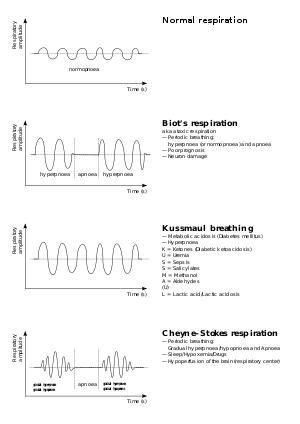 Graph showing Kussmaul breathing (second from bottom) and other pathological breathing patterns.