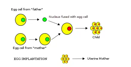 There is theoretical work being done on creating a zygote from two women which would enable both women to be biological mothers, but it is yet to be practically implemented.[10] Creating a sperm from an egg and using it to fertilize another egg may offer a solution to this issue,[6] as could a process analogous to somatic cell nuclear transfer involving two eggs being fused together.[18]