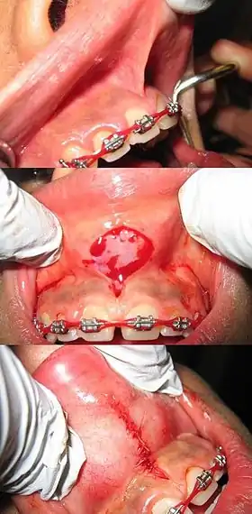 ![]() A labial frenectomy. The uppermost photo displays a maxillary labial frenum that was deemed disruptive to orthodontic treatment by the patient's orthodontist. The middle photo displays the labial fold after the frenum was incised (note the diamond-shaped wound). The third photo displays the wound after suturing of the incision which was completed. | |