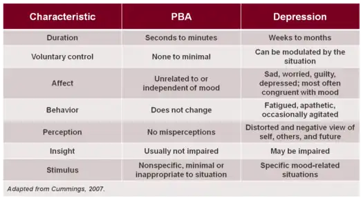 In depressive and bipolar disorders, crying, anger or laughter are typically indicative of mood, whereas the pathological displays of crying which occur in PBA are often in contrast to the underlying mood, or greatly in excess of the mood or eliciting stimulus. In addition, a key to differentiating depression from PBA is duration: PBA episodes are sudden, occurring in an episodic manner, while crying in depression is a more sustained presentation and closely relates to the underlying mood state. The level of control that one has over the crying, anger or other emotional displays in PBA is minimal or nonexistent, whereas for those with depression, the emotional expression (typically crying) can be modulated by the situation. Similarly, the trigger for episodes of crying in patients with PBA may be nonspecific, minimal or inappropriate to the situation, but in depression the stimulus is specific to the mood-related condition. These differences are outlined in the adjacent Table.