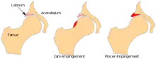 The acetabular labrum is a fibrocartilagenous structure similar in composition to the meniscus. It is a ring of tissue that surrounds the acetabulum of the pelvis, and allows the head of the femur to articulate smoothly and efficiently with the acetabulum. The labrum plays an important role in maintaining the biomechanical stability of the hip joint. Studies[6] have shown that damage to the labral tissue can result in disruption of the labral suction-seal, a fluid force paramount in maintaining hip joint integrity. An intact labrum also helps to buttress the hip joint to distraction forces.[7] The labrum, when damaged, is also a pain generator, due to a large concentration of type II pain-associated free nerve endings found throughout the tissue, most pronounced at the labral base.[8]
