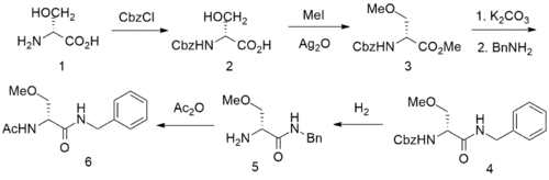 (R)-2-amino-3-hydroxypropanoic acid is treated with acetic anhydride and acetic acid. The product is treated first with N-methylmorpholine, isobutyl chloroformate, and benzylamine, next with methyl iodide and silver oxide, forming lacosamide.[38]