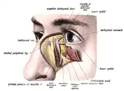 ![]() The lacrimal apparatusis shown through dissection on the left side. | |