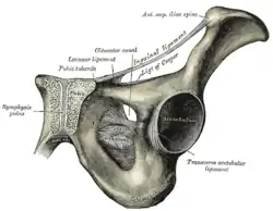 ![]() The inguinal and lacunar ligaments. (Lacunar ligament labeled at center top.) | |