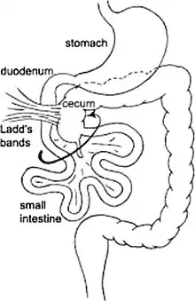 A surgical operation called a "Ladd procedure" is performed to alleviate intestinal malrotation. The procedure involves counterclockwise detorsion of the bowel, surgical division of Ladd's bands (shown in image), widening of the small intestine's mesentery, performing an appendectomy, and reorientation of the small bowel on the right and the cecum and colon on the left (the appendectomy is performed so as not to be confused by atypical presentation of appendicitis at a later date). Most Ladd surgical repairs take place in infancy or childhood.