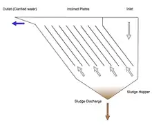 Typical lamella clarifier design consists of a series of inclined plates inside a vessel, see first figure. The untreated feed water stream enters from the top of the vessel and flows down a feed channel underneath the inclined plates. Water then flows up inside the clarifier between the inclined plates. During this time solids settle onto the plates and eventually fall to the bottom of the vessel.[3] The route a particle takes will be dependent upon the flow rate of the suspension and the settling rate of the particle and can be seen in the second figure. At the bottom of the vessel a hopper or funnel collects these particles as sludge. Sludge may be continuously or intermittently discharged. Above the inclined plates all particles have settled and clarified water is produced which is drawn off into an outlet channel. The clarified water exits the system in an outlet stream.
