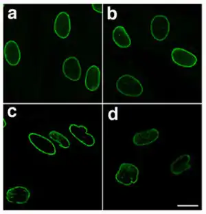 | Normal nuclear lamina (a and b) and mutant nuclear lamina (c and d) from a patient with HGPS, visualized by immunofluorescence - note the irregular and bumpy shape of the laminopathic nuclei[1] | |