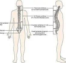 The spinal cord is housed in a bony hollow tube called the vertebral column.[3] The vertebral column is composed of many ring-like bones called vertebra (plural: vertebrae) and it spans from the skull to the sacrum. Each vertebra has a hole in the center called the vertebral foramen through which the spinal cord traverses.[3]