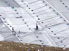 Landfill gas collection is typically accomplished through the installation of wells installed vertically and/or horizontally in the waste mass. Design heuristics for vertical wells call for about one well per acre of landfill surface, whereas horizontal wells are normally spaced about 50 to 200 feet apart on center.[9] Efficient gas collection can be accomplished at both open and closed landfills, but closed landfills have systems that are more efficient, owing to greater deployment of collection infrastructure since active filling is not occurring. On average, closed landfills have gas collection systems that capture about 84% of produced gas, compared to about 67% for open landfills.[11] Landfill gas can also be extracted through horizontal trenches instead of vertical wells. Both systems are effective at collecting. Landfill gas is extracted and piped to a main collection header, where it is sent to be treated or flared. The main collection header can be connected to the leachate collection system to collect condensate forming in the pipes. A blower is needed to pull the gas from the collection wells to the collection header and further downstream. A 40-acre (160,000 m2) landfill gas collection system with a flare designed for a 600 ft3/min extraction rate is estimated to cost $991,000 (approximately $24,000 per acre) with annual operation and maintenance costs of $166,000 per year at $2,250 per well, $4,500 per flare and $44,500 per year to operate the blower (2008). LMOP provides a software model to predict collection system costs.[9]