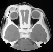 CT scan showing LCH infiltrating peri-orbital tissue (arrowed).