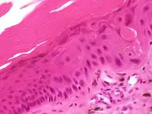 Large-cell acanthomas are a cutaneous condition characterized by small, skin-colored, hyper- or hypopigmented papules or plaques.[1]