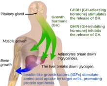 Under normal circumstances in humans, growth hormone (GH) is released in a pulsatile fashion from cells known as somatotrophs in the anterior pituitary gland.[16] These pulses of GH are regulated by cells in the hypothalamus, via the release of growth hormone-releasing hormone (GHRH) into the hypothalamohypophysial system when stimulated by insulin, ghrelin, glucagon, arginine, deep sleep, exercise, fasting, sex hormone release during puberty, and a host of other factors.[16] GH release is inhibited by somatostatin (GHIH), IGF-1, hyperglycemia, and glucocorticoids.[16] Once released, the GH molecules travel through the bloodstream and eventually bind to GH receptors on the surface of cells composing bodily organs and tissues.[16] One major site of action for GH is in the liver, where it stimulates gluconeogenesis and the release of IGF-1 through the JAK-STAT signaling pathway.[16] IGF-1 promotes growth in a variety of tissues throughout the body, especially bone mineralization, and provides negative feedback on GH release.[16] GH results in increased muscle mass, lipolysis, and protein synthesis.[16] Obesity and increased adipose tissue, especially visceral fat, results in reduced GH secretion.[16] There is a natural age-related decline in the GHRH-stimulated release of GH.[16]