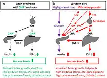 LS is generally classified as "primary" GH insensitivity, which is distinguished from "secondary" GH insensitivity.[1] Primary (congenital/hereditary) GH insensitivity may result from growth hormone receptor defects, as in the case of Laron syndrome, but can also be caused by defective post-receptor signal transduction (STAT5B), abnormalities of the IGF-1 gene or IGF-1 receptor.[2][1] Secondary (acquired) GH insensitivity results from antibodies to growth hormone or the growth hormone receptor, as well as poor nutritional status, liver disease or diabetes mellitus.[5][6] A GHR mutation that results in only partial insensitivity to GH can manifest as a form of idiopathic short stature.[2][8]