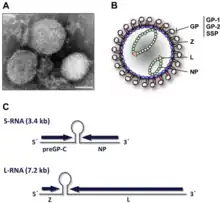 Lassa viruses[14][15] are enveloped, single-stranded, bisegmented, ambisense RNA viruses. Their genome[16] is contained in two RNA segments that code for two proteins each, one in each sense, for a total of four viral proteins.[17] The large segment encodes a small zinc finger protein (Z) that regulates transcription and replication,[18][19] and the RNA polymerase (L). The small segment encodes the nucleoprotein (NP) and the surface glycoprotein precursor (GP, also known as the viral spike), which is proteolytically cleaved into the envelope glycoproteins GP1 and GP2 that bind to the alpha-dystroglycan receptor and mediate host cell entry.[20]