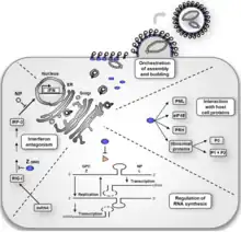 The main targets of the virus are antigen-presenting cells, mainly dendritic cells and endothelial cells.[26][27][28] In 2012 it was reported how Lassa mammarenavirus nucleoprotein (NP) sabotages the host's innate immune system response. Generally, when a pathogen enters into a host, innate defense system recognizes the pathogen-associated molecular patterns (PAMP) and activates an immune response. One of the mechanisms detects double stranded RNA (dsRNA), which is only synthesized by negative-sense viruses. In the cytoplasm, dsRNA receptors, such as RIG-I (retinoic acid-inducible gene I) and MDA-5 (melanoma differentiation associated gene 5), detect dsRNAs and initiate signaling pathways that translocate IRF-3 (interferon regulatory factor 3) and other transcription factors to the nucleus. Translocated transcription factors activate expression of interferons 𝛂 and 𝛃, and these initiate adaptive immunity. NP encoded in Lassa mammarenavirus is essential in viral replication and transcription, but it also suppresses host innate IFN response by inhibiting translocation of IRF-3. NP of Lassa mammarenavirus is reported to have an exonuclease activity to only dsRNAs.[29] the NP dsRNA exonuclease activity counteracts IFN responses by digesting the PAMPs thus allowing the virus to evade host immune responses.[30]